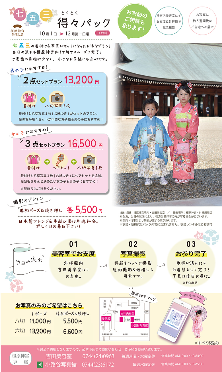 ご予約・お問い合わせ TEL 0744-23-6172                                         橿原神宮七五三,衣裳レンタル,七五三衣裳,七五三パック,七五三レンタル,七五三写真,神宮七五三